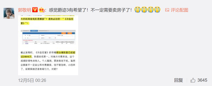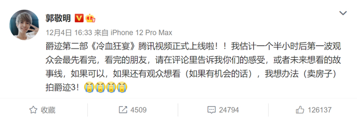 《冷血狂宴》上线当天,郭敬明发微博称:如果可以,如果还有观众想看(如果有机会的话),我想办法(卖房子)拍爵迹3!
