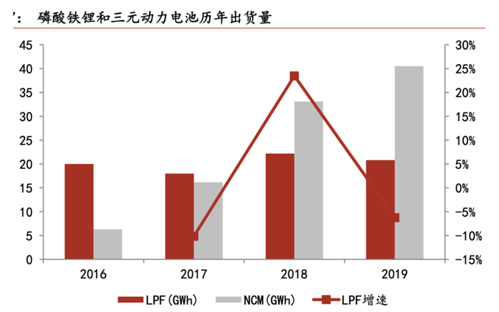 磷酸铁锂(LPF)和三元锂(NCM)历年出货量来源:川财证劵