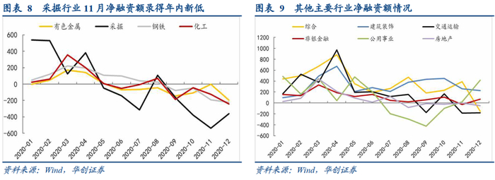 采掘行业,在进口煤受限、地方环保限产政策的持续影响下,短期内煤炭供给或依然偏紧,对煤炭价格仍有支撑,同时下游需求稳定,采掘行业盈利端有望持续修复。但从融资角度来看,2020年4月之后,煤企净融资额持续下行,11月永煤违约的影响下,市场对煤炭债规避情绪加重,可能加剧2021年煤企再融资难度。同时,煤企重组不断推进,资产划转也有可能带动一些大型煤企经营面的改善,主体间的融资分化或会加大。