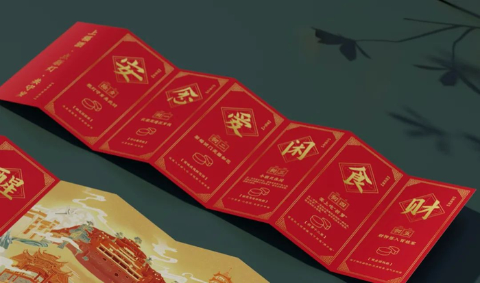 「春节民俗别册」1:风琴折页的设计形式,打开内容尽在眼前。2:详细展示了礼盒中三组礼品的设计理念和对应的民俗传说。