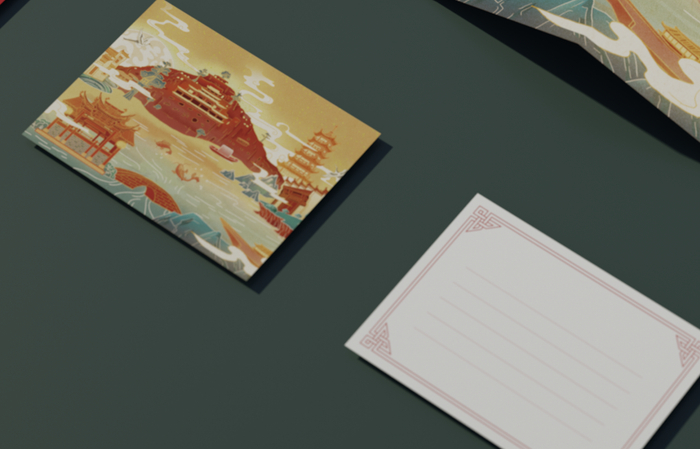 「贺卡」双面印刷,延续主图案的风格设计,中式窗花围绕信纸一圈。三五行亲笔字,真心祝福最真挚。