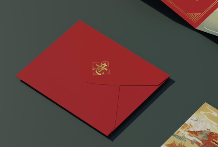 「信封」大红色信封,“意”字烫金,装入新年祝福,送到亲人手中。