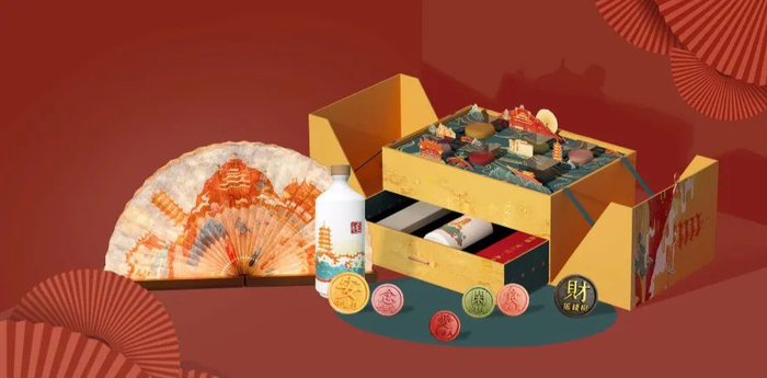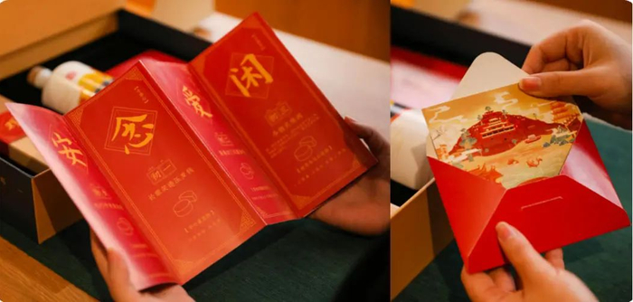 礼盒遵循传统守岁文化,提取守岁场景的氛围营造,及全家一起守岁时需要的实物组合而成,包含三组礼品:「上福酒」、「点新灯」、「共守岁」。