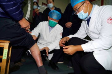 在福建省晋江市中医院动物咬蛰伤科,北京大学人民医院急诊科副主任、创伤救治中心副主任、中国医学救援协会动物伤害救治分会会长王传林(中)和福建省晋江市中医院急诊科庄鸿志(右)检查被红火蚁咬伤的患者。健康时报记者牛宏超/摄