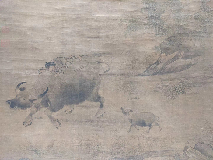 宋李唐《乳牛图》写牧童趴伏牛背,小牛随后引颈低呼,写实捕捉母子亲情。画牛用淡墨钩轮廓,以笔丝出涡纹牛毛,下腹加以烘染,形体神韵描绘具佳。背景平坦地上长有青草,岸边山石点缀,恬静的江南景色。画上无款印,题签梁清标(1620-1691)订为李唐。