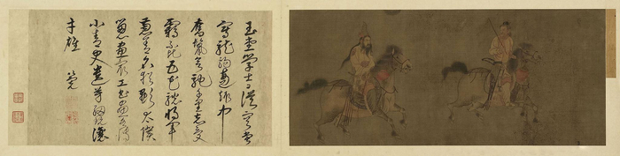 其中传唐韩幹 《猿马》旧题韩幹作,但徽宗题字和“御书”一玺,及理宗“缉熙殿宝”玺皆存疑,或为南宋后人仿作;宋人《番骑出猎图》与现藏美国波士顿艺术博物馆的同名长卷构图相似。元代倪瓒《修竹图》用笔瘦劲,得清简之韵。