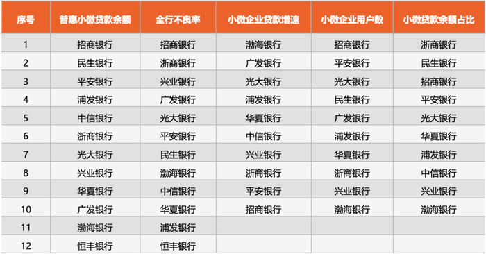表 3:12家全国性股份制银行的各项小微金融业务指标综合排名