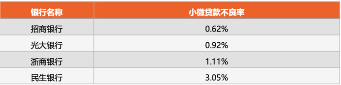 2、需要特别指出的是,在12家股份制银行中,仅有招商银行、光大银行、浙商银行和民生银行这四家披露了“小微贷款不良率”,因此,出于数据的一致性和可比性考虑,我们选取一家银行的不良率,而非按照小微贷款不良率。