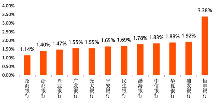研究发现,招商银行的全行不良率最低,仅为1.14%,除了恒丰银行的全行不良率略高,达到3.38%,其他11家均在2%之内。在疫情全球化蔓延态势下,我国银行业保持较为稳定的不良率,表明各家银行的风险控制达到标准。
