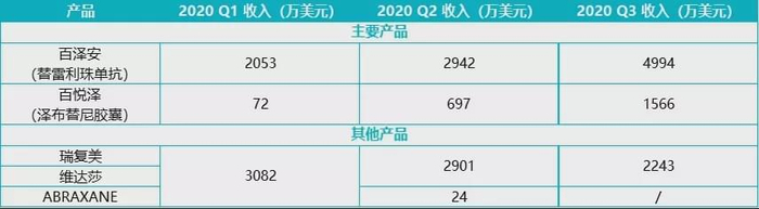 截至2020年9月30日,百济神州共实现销售收入9108万美元,较2019年同期的5014万美元增长81.6%。其中,百泽安(替雷利珠单抗)实现收入4994万美元,百悦泽(泽布替尼胶囊)实现收入1566万美元。此外,公司与BMS合作的瑞复美等产品实现销售收入2243万美元。整体来看,百济神州自研产品销售收入一直在稳步提高。