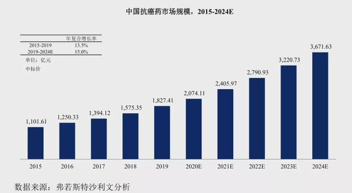 近年来,受癌症患者人数增多的影响,我国抗肿瘤药物市场的规模持续快速增长。根据弗若斯特沙利文报告,2015-2019年,我国抗癌药市场规模已经从1102亿元增长至1827亿元,预计至2024年将进一步增长至3672亿元。