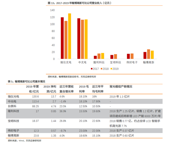翰博高新在大陆可比公司中营收亮眼,相比台湾可比公司尚有提升空间。瑞仪光电及中光电进入中尺寸背光显示模组行业较早,与瑞仪光电及中光电相比,公司在营业收入、净利润规模方面尚有提升空间。公司营业收入规模大于隆利科技、宝明科技及伟时电子,净利润规模与隆利科技、宝明科技及伟时电子存在差异,该差异主要系公司与隆利科技、宝明科技及伟时电子主要产品存在差异所致。