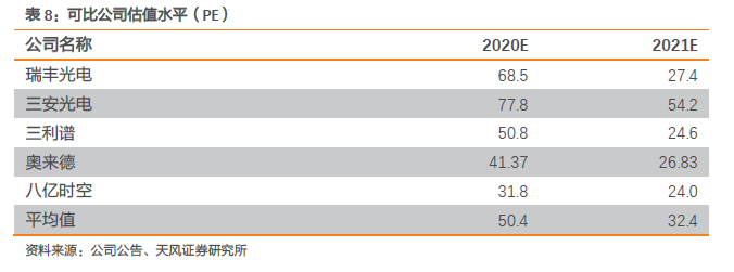 可比公司,我们选择了瑞丰光电、三安光电、三利谱、奥来德和八亿时空,考虑到公司20-21年业绩的高增速,给予公司21年30倍PE,对应目标价110.4元/股,首次覆盖,给予买入评级。