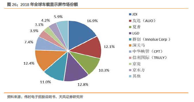 中、日、韩资企业呈现三组鼎立态势,汽车产量总量有望保持平稳增长。2018年上述行业内前10家公司全球车载TFT-LCD显示器市场份额合计约为94%。根据LMC Automotive发布的世界汽车展望 Global Light Vehicle Overview)预测,2017年至2022 年,全球汽车产量复合增长率约为3%。