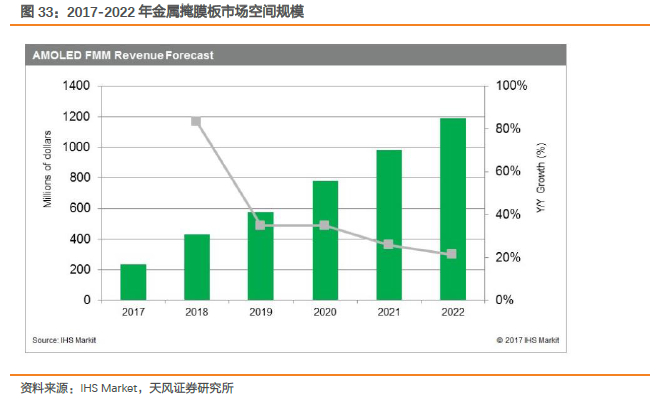 LED的高景气,带动OLED产业链配套的OLED MASK市场高景气。每条OLED6代线每年大概需要消耗200套金属掩模版,随着我国OLED产线的不断增加,OLED金属掩模版市场空间非常大。据研究机构IHS Market预计,高精度金属掩膜版市场将以38%的年复合增长率从2017年的2.34亿美元增长到2022年的12亿美元。