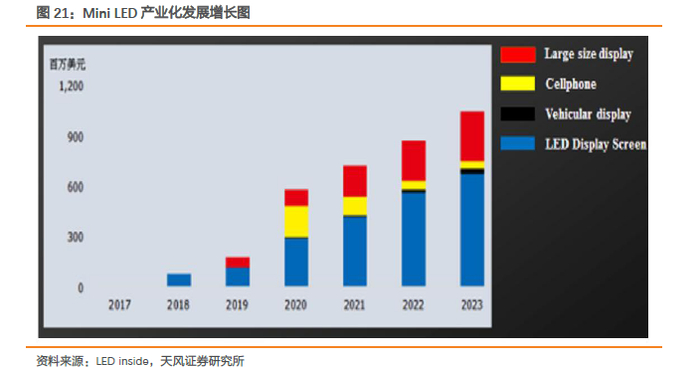 Mini LED背光和显示技术具有其他技术无法比拟的产业化优势,Mini LED未来的发展方向,涵盖了大、中、小尺寸LCD显示背光以及LED显示屏等方面,据LED inside数据显示,预计到2023年整体Mini LED产值超过10亿美元,其中LED显示屏以及大尺寸电视将成为Mini LED未来应用的主流产品。