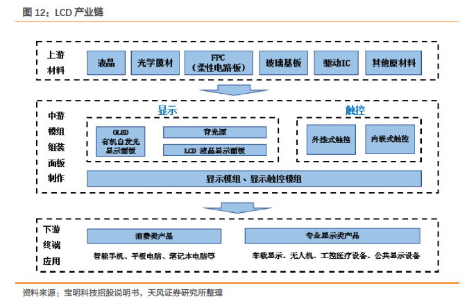 背光显示模组位居LCD产业链的上游端,是LCD面板的核心材料。液晶显示(LCD)产品制造涉及光学、半导体、电子工程、化工、高分子材料等各领域,所需技术层面较广。纵观LCD产业链,上游为各种原材料生产厂商,主要原材料有液晶材料、彩色滤光片、驱动IC、偏光片、背光模组、玻璃基片等;中游为各式LCD面板厂商;下游为各类整机产品厂商,主要分为中小尺寸和大尺寸两大类。