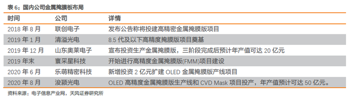 18年以来国内企业加快布局金属掩模版产业,加速中低端市场国产化。随着OLED面板行业整体投资速度的加快,OLED产业链配套正在快速扩张,许多企业从2018年开始增加对掩膜版市场空间非常大。但是国内生产的金属掩膜版质量还有待提高,此前的产品更多应用在中低端市场,应用于8代及以上的大尺寸OLED面板的金属掩膜版和高精细金属掩膜版仍然以进口产品为主。