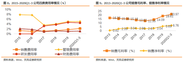 企业规模扩张期间费用逐年增长,近年来毛利率呈现稳步增长的态势。2017-2020Q1-3年期间费用占营业收入的比例分别为8.88%、10.43%和12.57%和12.93%,主要原因系随着公司经营规模扩大,公司期间费用逐年增长。2017-2020Q1-3年公司毛利率分别为12.55%、14.19%、18.61%和20.97%,呈现逐年上升趋势,主要原因系2018年公司为集中优势资源发展背光显示模组业务,主动缩减了毛利率较低的偏光片业务。