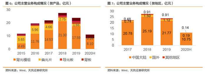 背光显示模组为主营业务收入的主要来源,业务主要集中于西南、华北和华东地区。2017-2019年,背光显示模组收入占营业收入分别为66.29%、77.43%和73.91%,是公司主营业务收入的主要来源。其中,2020H背光显示模组占比73.11%,营收yoy+44.82%,主要系客户京东方及群创光电需求量大。公司主营业务收入主要来源于中国大陆,2017-2020H来自中国大陆的收入占比分别为96.54%、94.38%、95.11%和97.02%。在销售地区分布上营业收入主要集中在西南、华北和华东地区,并且对着西南地区投资设立面板生产线,公司西南地区的销售收入逐年增长。