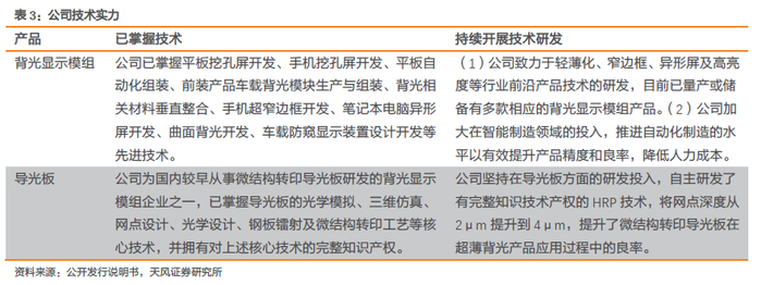 定制化设计的研发模式,以销定产的生产模式,公司技术实力强盛。公司拥有一支专业且具备创新能力的研发团队,可依据客户需求提供产品企划、方案评估、材料选择、模具设计、零件设计、产品整体结构及光学设计的一体化解决方案。同时,公司已掌握背光显示模组和导光板领域相关先进和核心技术,并持续进行行业前沿产品技术研发。