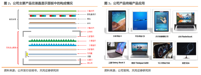 翰博高新主营产品为中尺寸背光显示模板,产品种类齐全,广泛应用于笔记本电脑和平板等终端产品。液晶显示面板主要由背光显示模组与液晶屏幕构成,其中背光显示模组提供亮度适中、均匀分布的面状光源。翰博高新主要产品包含背光显示模组、导光板、精密结构件、光学材料等相关零部件。凭借多年积累的技术及经验,公司已成为国内产品种类较为齐全的背光显示模组厂商之一。
