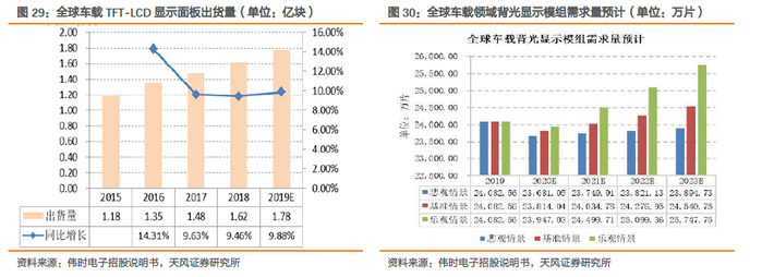 车载显示领域背光显示模组市场持续扩大,2023年预计需求量高达2.9亿片。根据IHS Markit预计,2019年全球车载TFT-LCD面板的全球出货量将至1.78亿块,同比增长9.88%;2025年全球车载TFT-LCD面板出货量约2.5亿块,2019年至2025年复合增长率约5.82%,平均每车平均搭配2块以上TFT-LCD显示屏,预计2023年全球车载领域背光模组需求量为2.7亿片至3.2亿片。