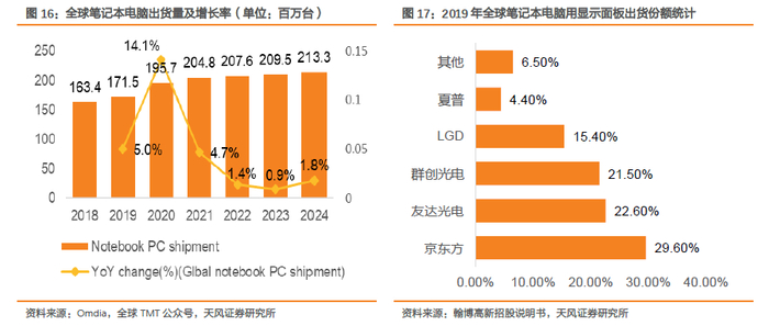 笔记本电脑的显示面板市场集中度极高,翰博高新是京东方主要供应商。2019年全球笔记本电脑用显示面板出货量前五名分别为京东方、友达光电、群创光电、LGD和夏普,合计占整体市场90%以上,形成垄断局面。2019年翰博高新是京东方笔记本电脑背光显示模组的重要供应商,京东方笔记本电脑所用背光显示模组主要由其子公司京东方茶谷和公司供应。