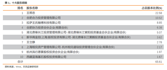 前十大股东持股占比65.61%,控股股东合作密切,签署《一致行动协议》。王照忠为公司的实际控制人和最终受益人,持有公司22.58%的股份,同时分别持有公司股东王氏翰博、合肥合力、合肥协力90%、90%和88.95%的股份,合计控制公司45.69%表决权。同时,为了强化和优化公司的控制和管理,2020年6月史玲与王照忠、王立静签署《一致行动协议》。