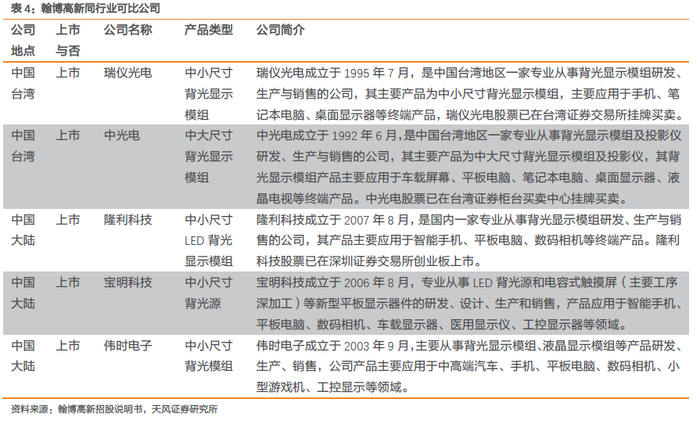 背光显示模组行业生产工艺复杂,行业的生产技术和工艺需要多年的技术和经验的积累,形成了行业较高的技术工艺壁垒。行业中从事中尺寸背光显示模组的生产及销售公司主要集中在中国台湾地区,中国大陆地区相关企业较少,其中有国内A股上市公司隆利科技、拟上市公司宝明科技、伟时电子为翰博高新同行业可比公司。