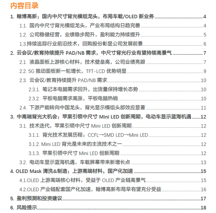 证券研究报告《翰博高新:中尺寸背光龙头,高景气&Mini LED&OLED Mask驱动持续成长》