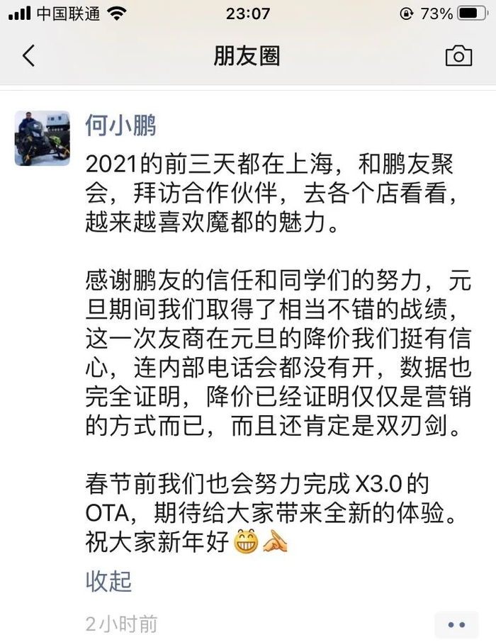 小鹏汽车CEO何小鹏在微信朋友圈表示,针对这一次友商在元旦的降价,小鹏挺有信心,连内部电话会都没有开,数据也完全证明,降价已经证明仅仅是营销的方式而已,而且还肯定是双刃剑。春节前小鹏也会努力完成×3.0的OTA,期待给大家带来全新的体验。
