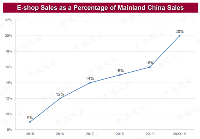 另外,大陆地区还有一个特点就是网上销售的占比在不断提升,上半年这一比例已经提升至20%。