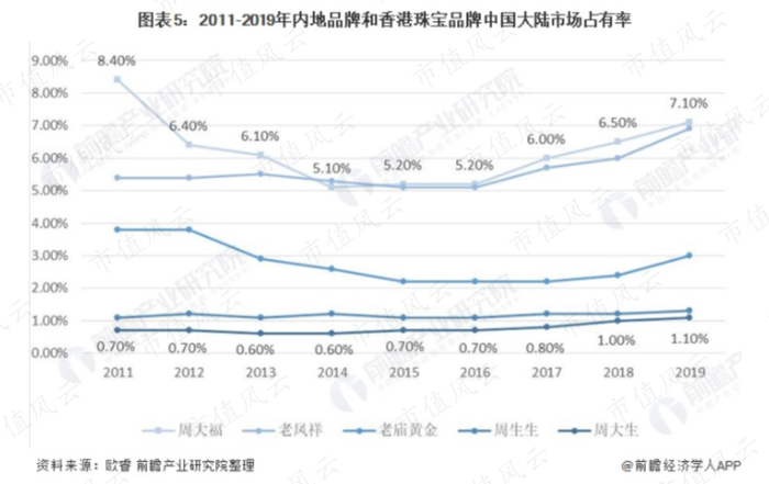 首先,根据2019年我国内地市场珠宝行业主要参与者的品牌市场占有率数据,排名前五的分别是周大福(01929.HK)、老凤祥(600612.SH)、老庙黄金、周生生及周大生(002867.SZ)。