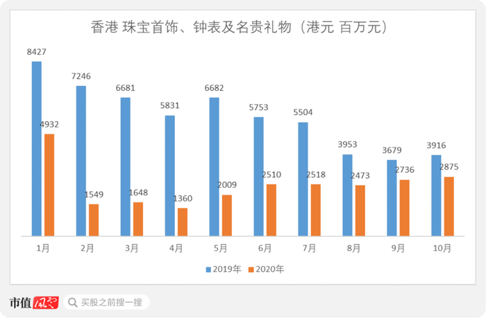 在跌幅最大的2月,同比下滑幅度为78.6%。但是2020年10月份,该细分项零售总额为28.75亿港元,同比下滑幅度收窄至26.6%。