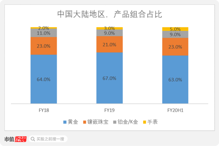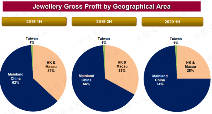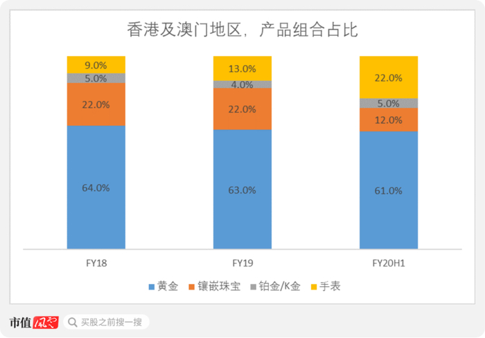 与香港及澳门地区一样,黄金依旧是核心产品,上半年销售收入占比达63%,相较2019年下降4个百分点。