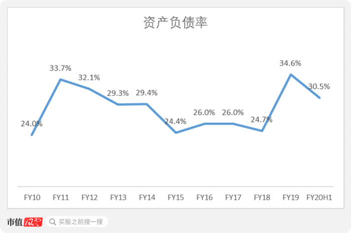 公司的资产负债率在2019年快速增长至34.6%,随后在2020年上半年下降至30.5%。