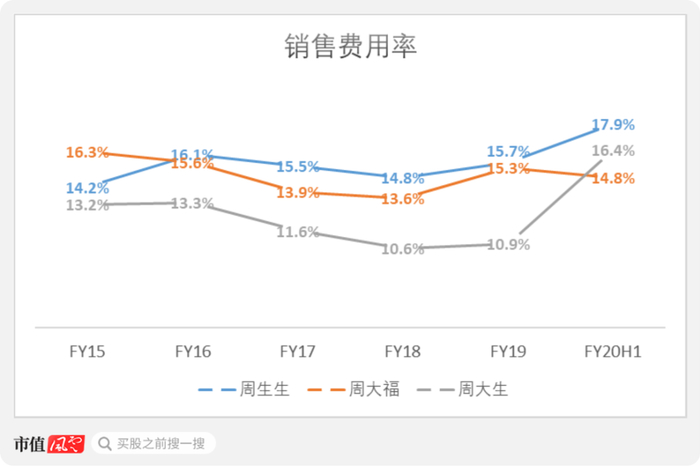 同期周大福为14.8%,周大生的销售费用率陡然增长至16.4%。