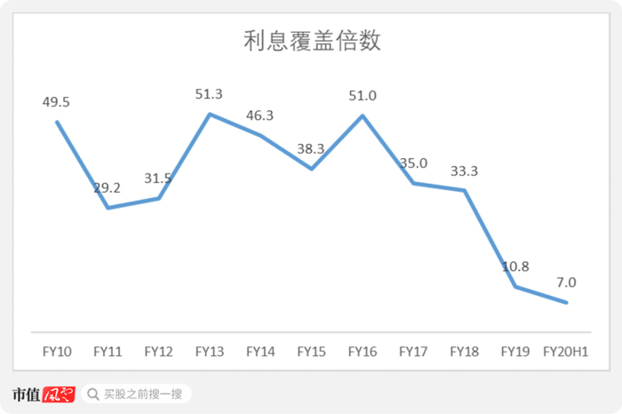 周生生的利息覆盖倍数近年来有所下降,在今年上半年达到7,利息偿付压力依旧不大。