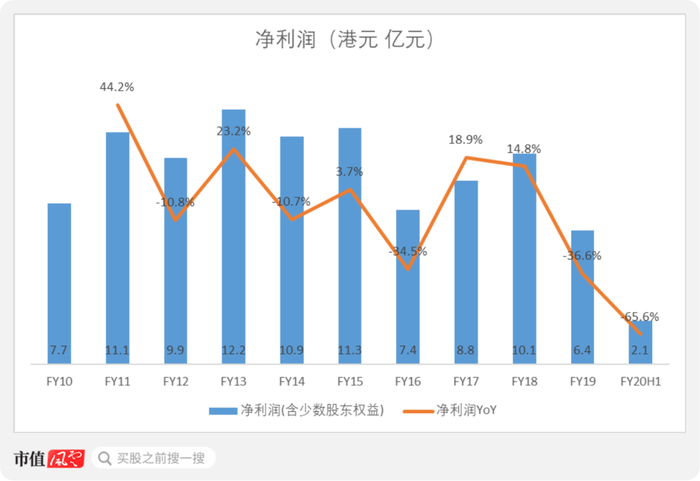 2020年上半年,净利润为2.1亿港元,同比下滑65.6%。