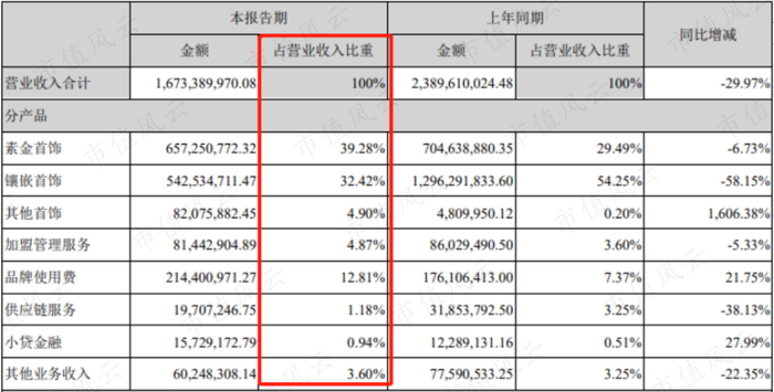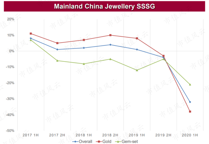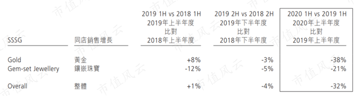 上半年,黄金业务同店销售收入同比下滑38%,镶嵌珠宝业务同店销售收入同比下滑21%。整体同店销售收入同比下滑32%。