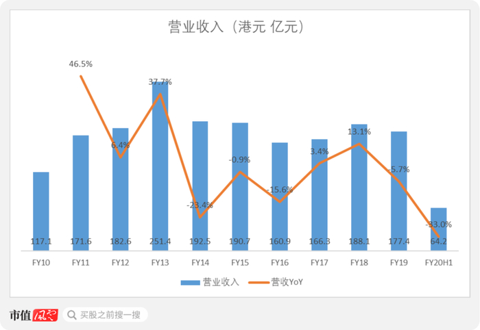 2020年上半年,公司营业收入为64.2亿港元,同比下滑33.0%,下滑幅度进一步扩大。