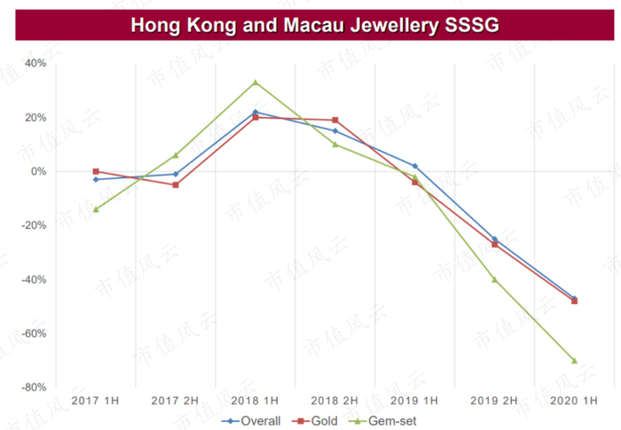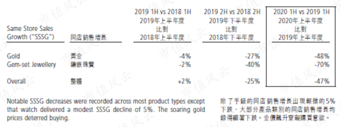 在上半年中,黄金业务同店销售收入同比下滑48%,珠宝镶嵌业务同店销售收入同比下滑70%,整体同比下滑47%。