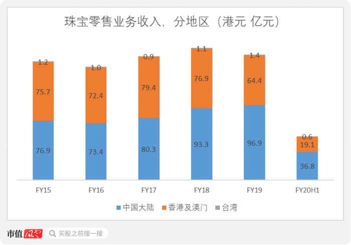 分地区来看珠宝零售业务,香港及澳门地区的收入从2017年的79.4亿港元下滑至2019年的64.4亿港元,并且在今年上半年暴跌46%至19.1亿港元。
