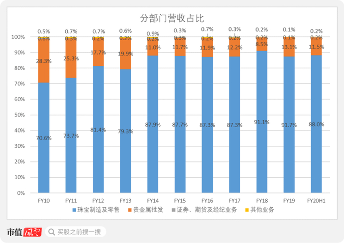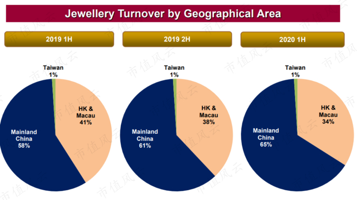 其他业务的营收占比在2020年上半年为0.2%,这部分主要为投资物业以赚取租金收入,以及其他与珠宝相关的业务。