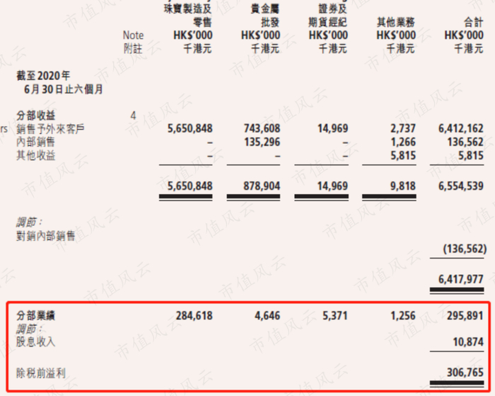 依照公司披露的分部业绩,这个就是调节股息收入前的除税前利润。珠宝制造及零售业务的除税前利润为2.8亿港元,占公司整体的96.2%,贡献的利润占比比营收占比还要高。