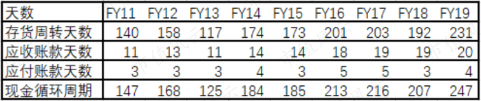公司的现金循环周期自2013年至今整体呈现不断提升的态势,在2019年提升至247天。