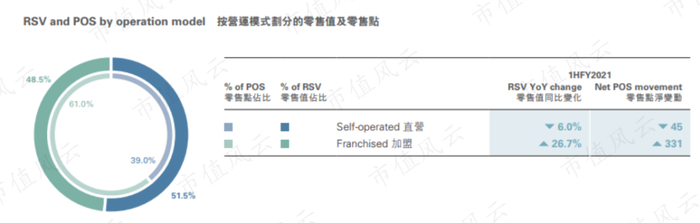 首先来看下周大福的门店数据,于2020年9月30日,周大福旗下加盟门店数量占比为61%,加盟门店零售额占比为48.5%。