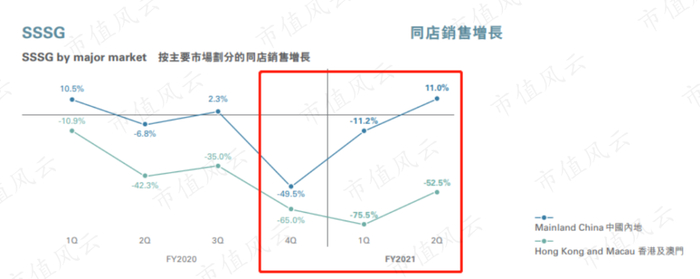 而香港地区的同店销售增速在2021年第二季度呈现进一步下滑,随后在第三季度出现回升。