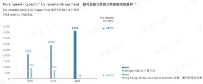另外,如下图所示是根据地区来划分主要经营利润,中国内地贡献的利润达40.5亿港元,同比增长42.5%。而香港及澳门等地区贡献的利润仅为2800万港元,同比下滑95.9%。